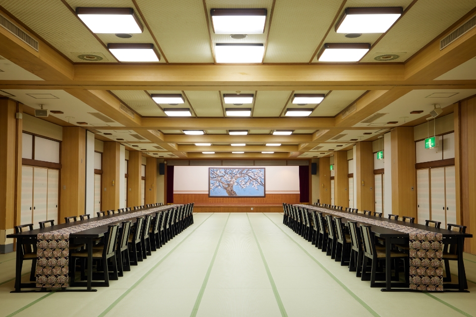 大人数での会議や研究会、各種宴会・パーティーなどにご利用いただける大広間です。総面積288.2㎡(192畳)で、間仕切りで5つの独立したスペースに区切ることができます。