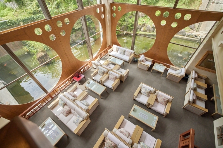 当館ロビーに併設されたカフェです。2階への吹き抜けと大きな窓からは、解放感いっぱいの日本庭園を見渡すことができます。